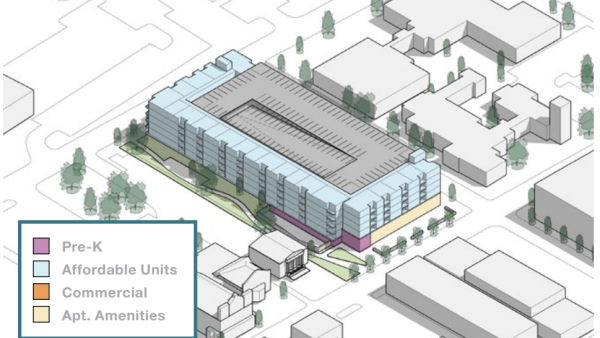 Mix of affordable and market rate residential units. Commercial space with area for a Pre-K child care facility. Large parking decks.