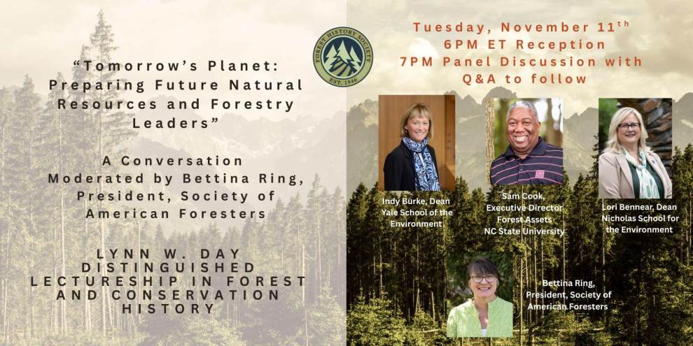 The Forest History Society is proud to announce the 2025 Lynn W. Day Lectureship in Forest and Conservation History will be a moderated discussion with three leading educators in the natural resources field. Join Bettina Ring, President of the Society of American Foresters and the Virginia State Director at The Nature Conservancy, as she talks with Indy Burke (Dean of the Yale School of the Environment), Sam Cook (Executive Director of Forest Assets at NC State University), and Lori Bennear (Dean of the Nicholas School for the Environment) about what it may take to prepare the next generation of stewards of the global environment. This event is free to attend, but registration is required.