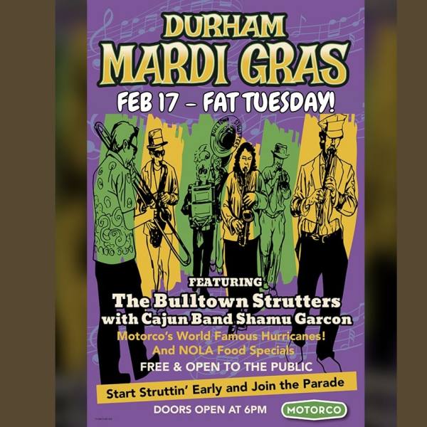 Celebrate Mardi Gras with the huge Bulltown Strutters Brass Band and Cajun Band Shamu Garcon. Arrive in festive attire or as you are. Dance, sing, second line and celebrate Fat Tuesday New Orleans joy, Durham style. Motorco will have their World Famous Hurricanes on tap and NOLA Food Specials from the kitchen.