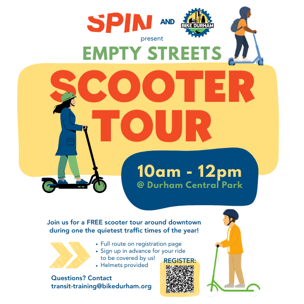 Join Bike Durham and Spin Scooters for a hands-on Transit Travel Training Ride exploring Durham on scooters!