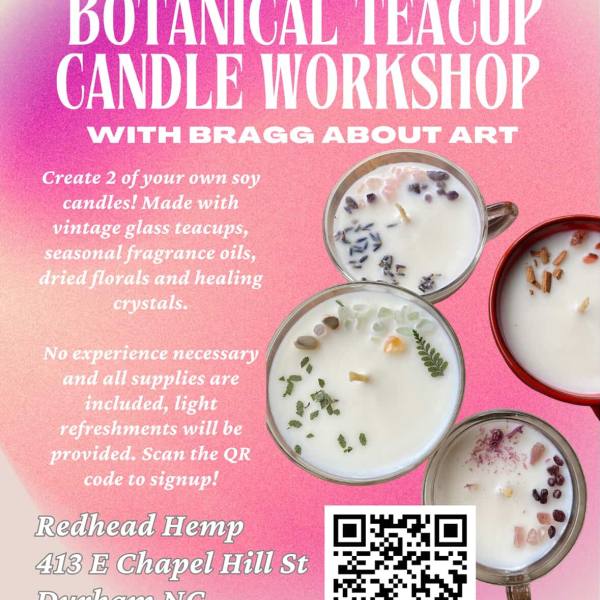 With Taylor Bragg of Bragg About Art! Create two soy candles made with vintage glass teacups, seasonal fragrances, dried florals and...