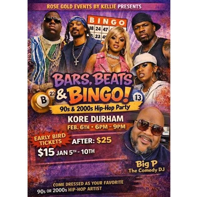 A throwback hip-hop bingo experience where classic bars, beats, and big prizes collide. Enjoy iconic music, signature cocktails, prizes, raffles, and nonstop fun hosted by Big P The Comedy DJ. Costumes encouraged!
