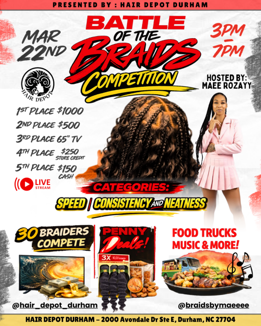 Hair Depot Durham proudly presents the “Battle of the Braids” Competition, an exciting live braiding event celebrating creativity, culture, and talent in the beauty industry.