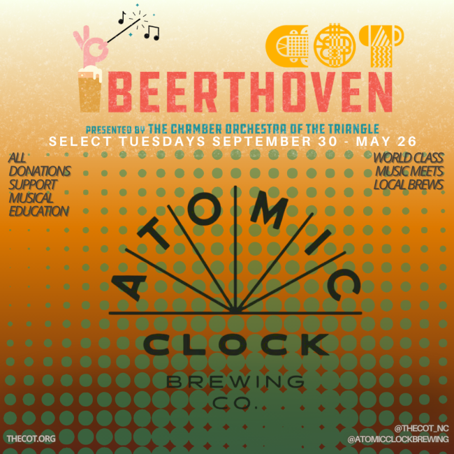 World-class music, tasty beer, and a great cause! Take part in this unusual trifecta at Atomic Clock Brewing, presented by The Chamber Orchestra of the Triangle (COT) .