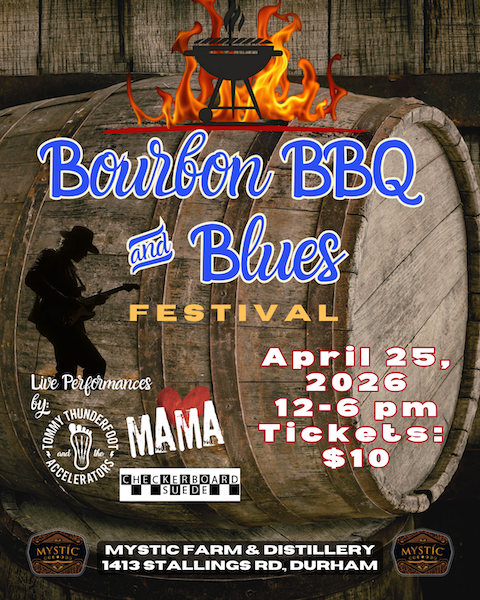 Get ready for a great day of bourbon drinkin', music listenin' and barbecue eatin' at the Mystic Farm & Distillery’s Bourbon, BBQ & Blues Festival! Listen to the Triangle's best blues bands while enjoying Mystic cocktails and FREE bourbon tasting all day.