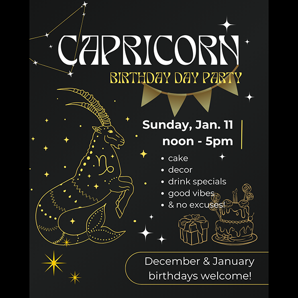 Celebrate with a proper birthday party for Capricorns who never get one. No holiday overlap, no “we’ll celebrate later,” no January excuses. Cake, decor and good vibes alongside specialty drinks (& N/A options) for our birthday celebrators!