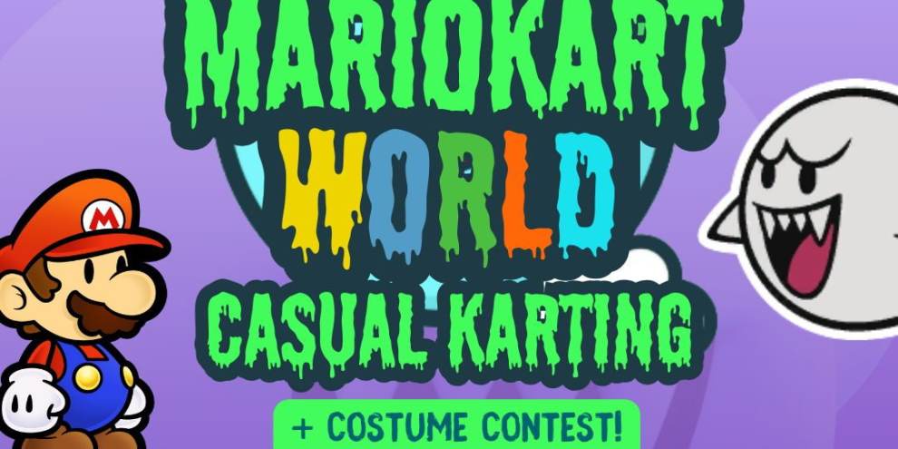 Four person Mario Kart World casual video game competition, all ages welcome. Featuring a costume contest only for October! Show up in your spoopiest outfit and win some candy by getting the most votes throughout the event.