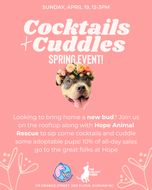 Looking to bring home a new bud? Join in on the rooftop to sip come cocktails and cuddle some adoptable pups from Hope Animal Rescue! These fundraisers are some of their FAVORITE events, and they need your help to run up the numbers as they donate 10% of all-day sales go to the great folks at Hope.