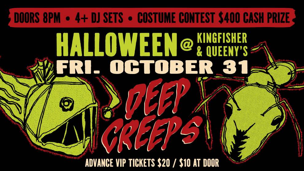 💀 JOIN in, 8pm-midnight (and really til 2am) for The Deep Creeps: a joint Kingfisher and Queeny’s Halloween throw down complete with 4+ DJs, a costume contest with a $400 cash prize, special Halloween drinks (read: spooky shots) & MORE.