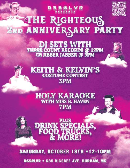 Praise be, Durham—your DSSOLVR taproom is turning 2 years old, and they’re celebrating the Gemstones way. Join a day-long revival of chaos featuring DJs, karaoke, photobooth, themed drinks, drink specials, food trucks, costumes, and enough beer to make Baby Billy proud.