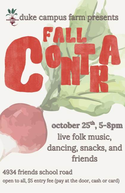 Join the Duke Campus Farm for their biannual Contra Dance! This community event wholeheartedly welcomes community members, students, staff, faculty, friends, fellow farmers, travelers passing through.... Guided by Eileen Thorsos, a long-time contra caller, and serenaded by Mara Shea on the fiddle and Dean Herington on piano, you will find yourself whisked away into a night of promenading, balancing, and do-si-do-ing with new friends. It's impossible not to come away from this evening beaming!