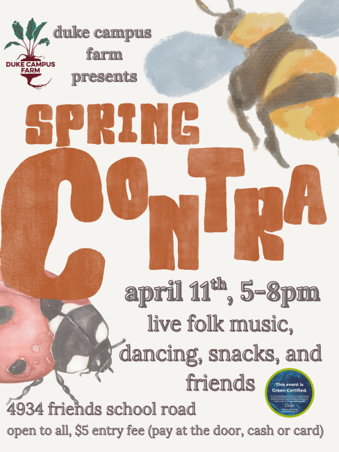 Join the Duke Campus Farm for a Spring Contra Dance! This community event wholeheartedly welcomes community members, students, staff, faculty, friends, fellow farmers, travelers passing through.... Guided by Eileen Thorsos, a long-time contra caller, and serenaded by Mara Shea on the fiddle and Dean Herington on piano, you will find yourself whisked away into a night of promenading, balancing, and do-si-do-ing with new friends. It's impossible not to come away from this evening beaming!