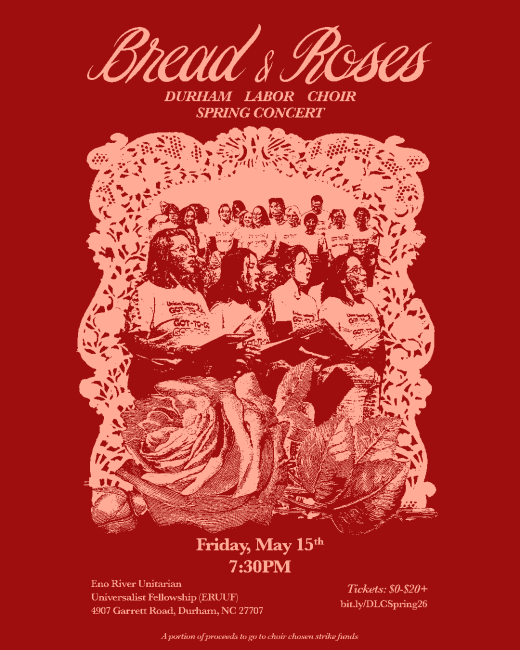 Get ready for an empowering evening with the Durham Labor Choir at their first Spring Concert! Experience powerful labor classics and new re-writes around the theme of textiles and women of the labor movement. Bring your friends, family, and co-workers!