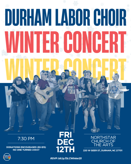 Join in for an evening of music, solidarity, and joy! The Durham Labor Choir is closing out the year with a lively winter concert featuring labor classics, reimagined pop hits, and amazing instrumental performances.