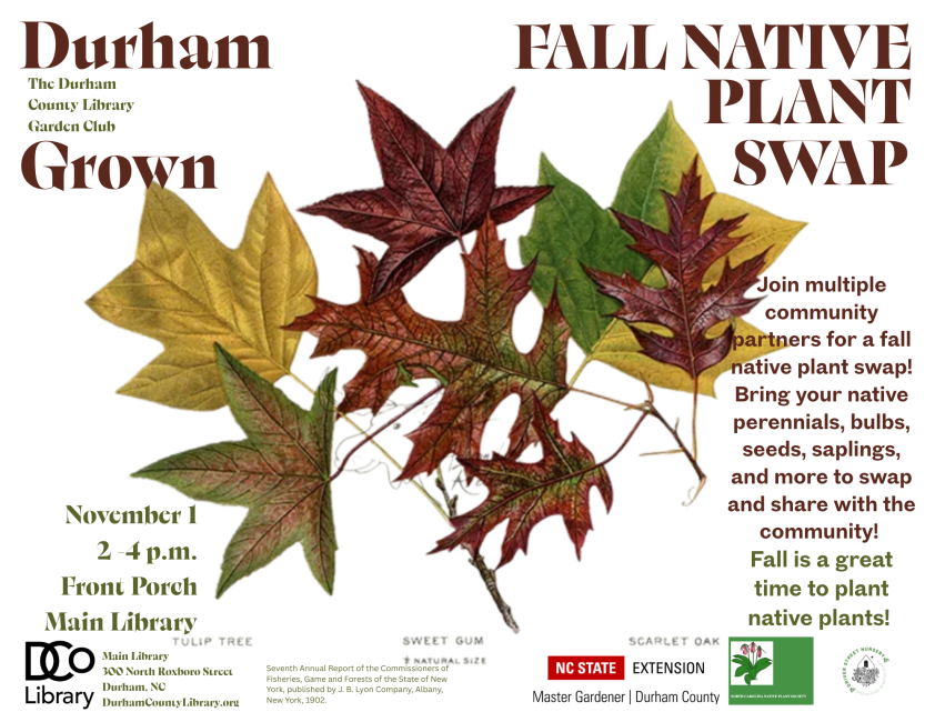 Join multiple community partners for a fall community native plant swap! With a special focus on native plants, bring your native perennials, saplings, shrubs, bulbs, and seeds to swap and share with other local gardeners interested in native plants! Non native plants that are not invasive are ok too! Have all your gardening questions answered by Durham County Extension Master Gardeners! Join community partners Driver Street Nursery and the North Carolina Native Plant Society to learn about native plants in Durham and how to successfully grow them in your garden to support biodiversity in Durham! Check out the Digging Durham Seed Library resources and seeds! Fall is a great time to plant to get a head start on next year’s native plant garden!