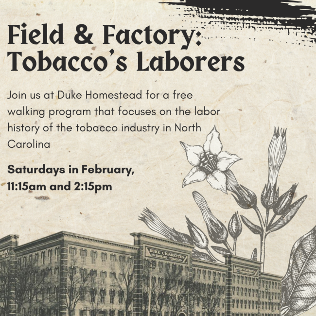 To learn a fuller story of the people who worked in tobacco, join Duke Homestead staff on site for a special program, “Field & Factory: A Look at Tobacco’s Laborers.” These walks will highlight the contributions that each group of people working in tobacco made to North Carolina’s culture and powerful economy in the late 19th and early 20th centuries, while addressing the inequalities in tobacco’s labor forces.