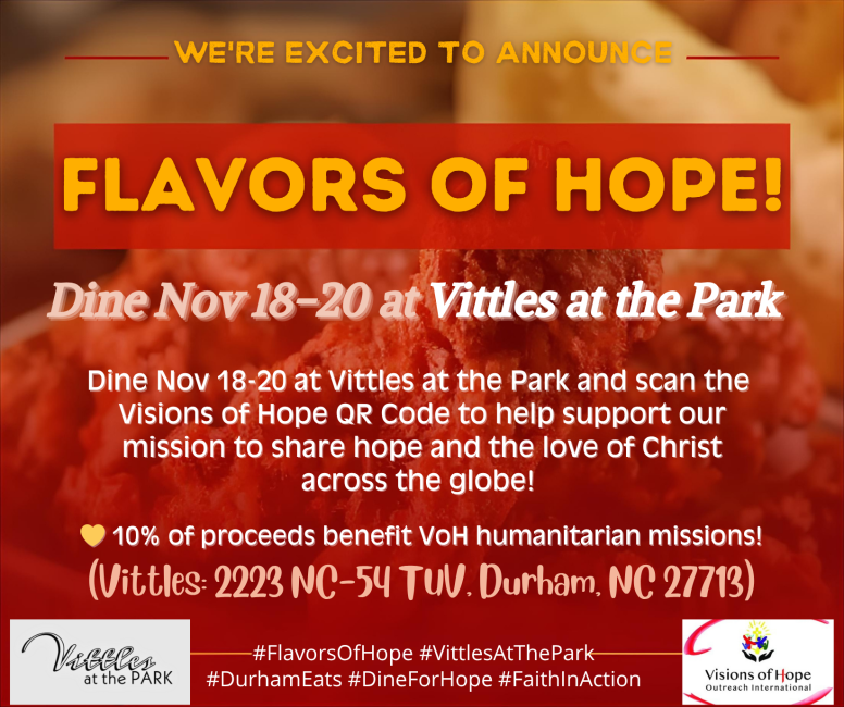 Join in for Flavors of Hope—a 3-day community dining event where 10% of all proceeds mentioning VoH at Vittles at the Park will benefit Visions of Hope Outreach International, a Durham-based nonprofit dedicated to “helping to heal the hurting nations by giving hope” through global humanitarian missions. Dine with purpose, scan the VoH QR code to give, and savor delicious Southern cooking.