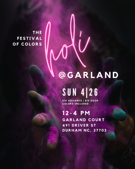 Join the third annual joyful explosion of color at Garland Court in East Durham. India's most colorful festival is all about new beginnings, celebrating the triumph of good over evil, marking the end of winter/welcoming spring, and embracing rebirth.