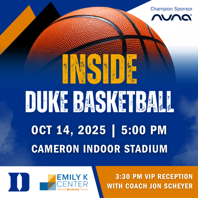 Inside Duke Basketball is an unique opportunity to watch a Duke Men’s Basketball private practice session to benefit the Emily K Center. Visit historic Cameron Indoor Stadium to watch Head Coach Jon Scheyer and the team in action as they prepare for the upcoming season. A limited number of VIP tickets are available that include the opportunity to attend an exclusive VIP reception with Coach Scheyer before the practice.