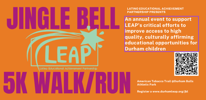 Latino Educational Achievement Partnership (LEAP), is hosting the Jingle Bell LEAP 5K Walk/Run, now in its 13th year! Our 2025 run/walk will be held at the American Tobacco Trail. Be a part of this event too! Join in for music, kids' fun run, and a timed 5K!