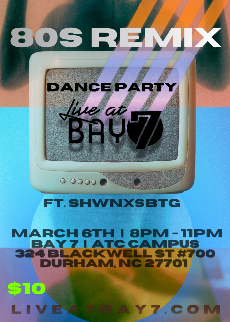 Celebrate Live at Bay 7's residency with an 80s dance party! Enjoy drinks from Fullsteam, a food stand, and a live DJ. Dance the night away with the artists and patrons of Live at Bay 7!