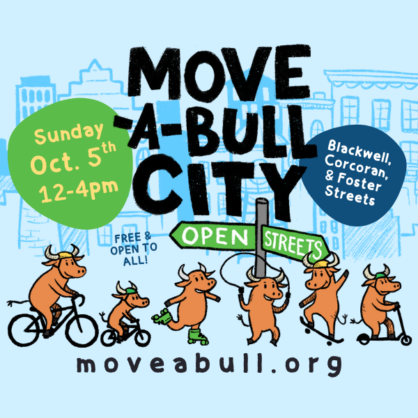 Move-A-Bull City Open Streets is a free, car-free celebration of active living in the heart of downtown Durham. On Sunday, October 5, from 12–4 pm, Bike Durham and community partners will transform Blackwell, Corcoran, and Foster Streets into a vibrant public space where people can walk, bike, roll, and play without the stress of traffic.