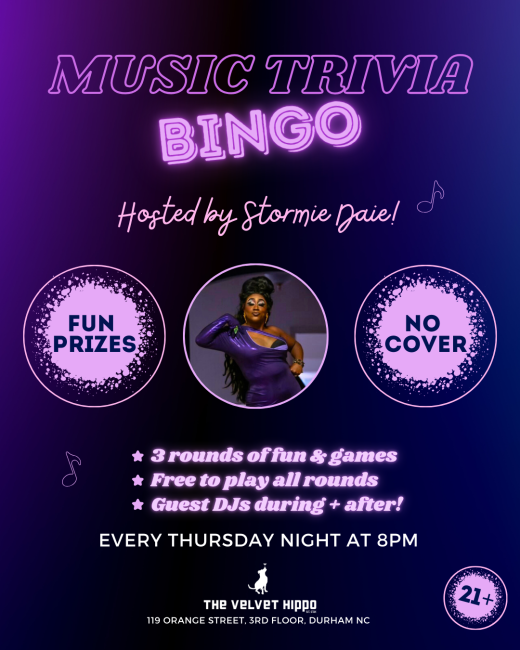 Join your Durham neighbors every Thursday night for Music Trivia Bingo with the one and only Stormie Daie! Grab a table with your crew and play any or all of 3 fun rounds curated by Stormie and sampled by her special guest DJs Gay Agenda or Jorden The DJ, who alternate weekly! Each round's winner gets a prize, and it's always free to participate. A great way to spend a weeknight with friends - and meet some new ones! Drink specials, no cover, 21+ with valid ID to enter.