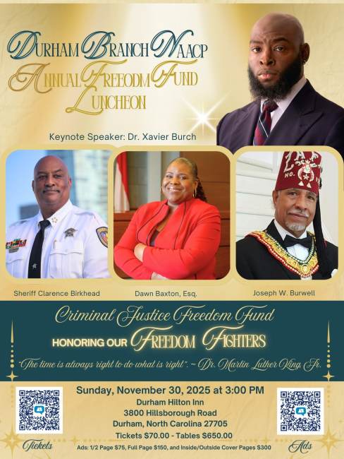 NAACP Durham Branch will be honoring Sheriff Clarence Birkhead, Chief Public Defender Dawn Baxton and Joseph Burwell.