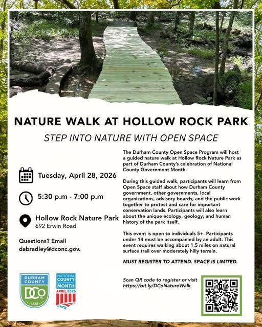 The Durham County Open Space Program will host a nature walk at Hollow Rock Nature Park as part of Durham County’s celebration of National County Government Month.