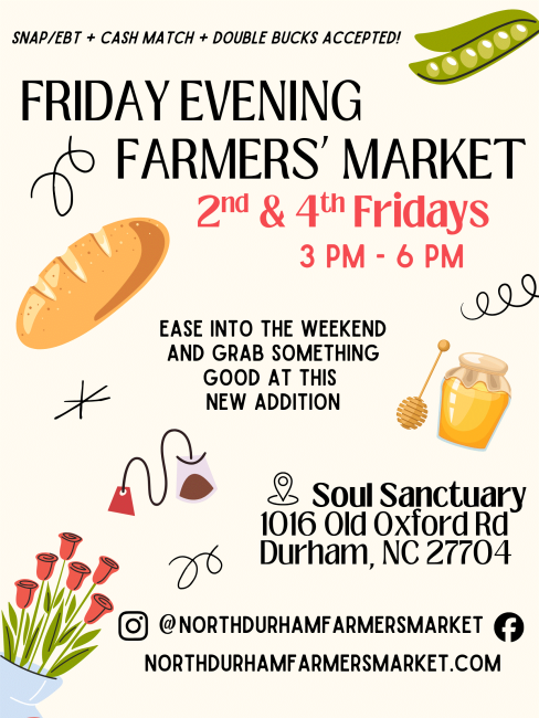 North Durham Farmers' Market is Durham's newest Farmers' Market centering BIPOC, LGBTQ+ and Women-led businesses. Visit every 2nd and 4th Friday evening each month from 3-6pm at Soul Sanctuary.