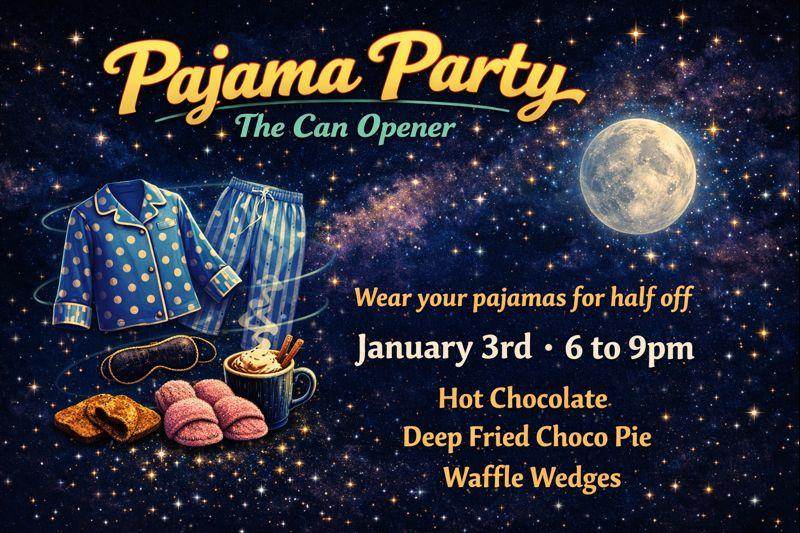Throw on your comfiest pajamas for a cozy, late night Pajama Party at The Can Opener. Wear your pajamas and get half off select treats all night.