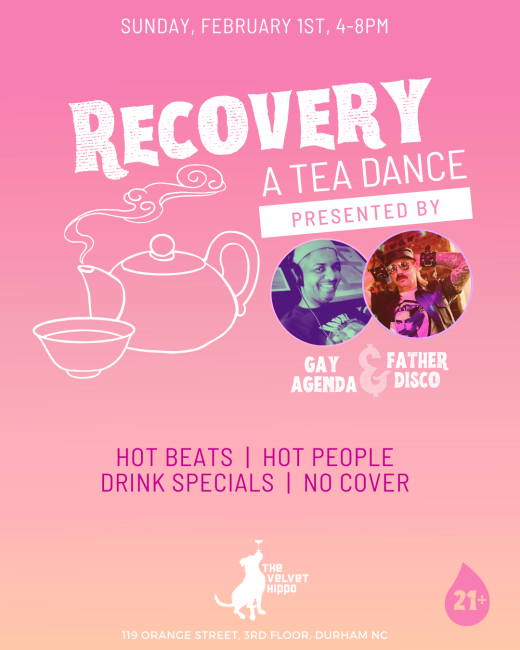 Mark your calendar for The Velvet Hippo's next day party! DJs Gay Agenda and Father Disco bring you Recovery: A Tea Dance. They’ll have drink specials (including mimosas and spritzes!) all day, and no cover. Spill the tea and dance the afternoon away with old friends — and make some new ones along the way! 21+ only with physical ID to enter. (This event was originally scheduled for 1/25 and was cancelled for weather).