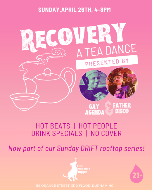 DJs Gay Agenda and Father Disco bring you Recovery: A Tea Dance – now part of the new Sunday DRIFT rooftop DJ series! Weather permitting, you’ll be up on the rooftop for this month’s Tea Dance. They’ll have drink specials (including mimosa pitchers and spritzes!) all day, and no cover. Spill the tea and dance the afternoon away with old friends — and make some new ones along the way! 21+ only with physical ID to enter.