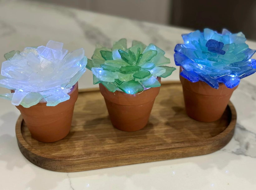 Guided from start to finish by experts from Hammer and Stain Carolina, you’ll design three glowing sea glass “succulents” that blend beach-inspired charm with elegant style. You’ll select your sea glass colors, assemble illuminated terracotta pots with warm white LED lights and build layered succulent shapes with expert guidance throughout. Each guest receives a complete kit with all materials, plus a wooden tray for a stunning final display.