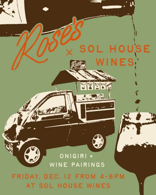 Sol House Wines is a new wine bar and shop located in Brightleaf Square! They just opened 4 weeks ago and will be partnering with Rose's Noodles, Dumplings and Sweets to do a pop-up event. Rose's will be parking their newly launched onigiri cart directly in front of Sol House Wines, and who will provide wine pairings with each onigiri flavor.