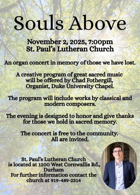 Duke University Chapel Organist, Chad Fothergill, will present a recital of music in commemoration of those we have lost. It will include poetry and music and will feature the organ music of J.S Bach, Olivier Messiaen, and others.