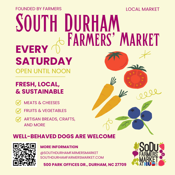 Join in weekly at the South Durham Farmers’ Market at Hub RTP, where you’re invited to celebrate local agriculture and cultivate community while you shop.