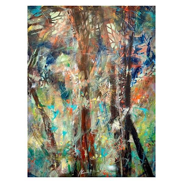 5 Points Gallery is proud to present Susan Woodson: Under the Trees, an exhibition that explores how light and color shape the sensory experience of being under a canopy. Layered greens, warm earth tones, and flashes of orange and red suggest sunlight, shadow, and the quiet wonder of time in nature. A companion series of vibrant bird paintings adds a playful counterpoint to the meditative abstractions.