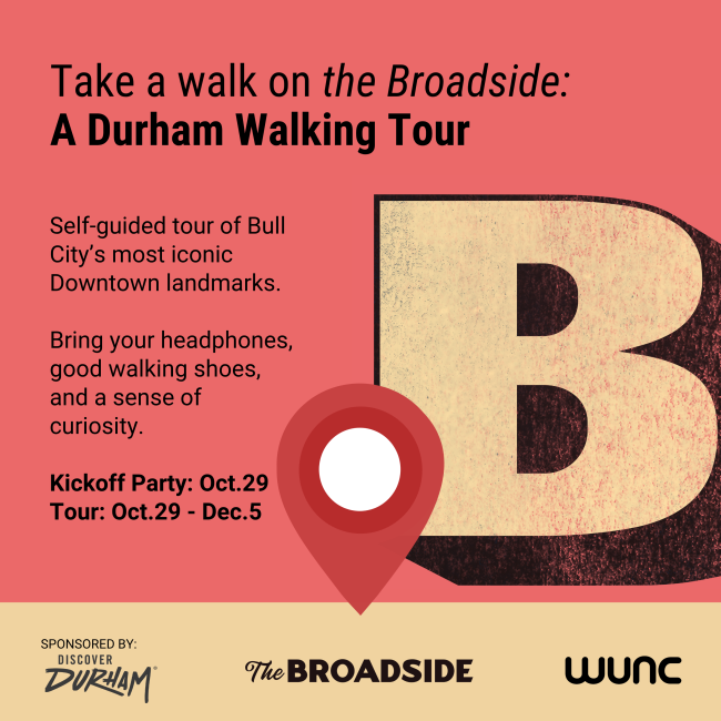 Join in at WUNC Durham Studios for the kickoff of Walk on the Broadside: Durham—a self-guided audio walking tour uncovering some of the Bull City’s most surprising and hidden stories.