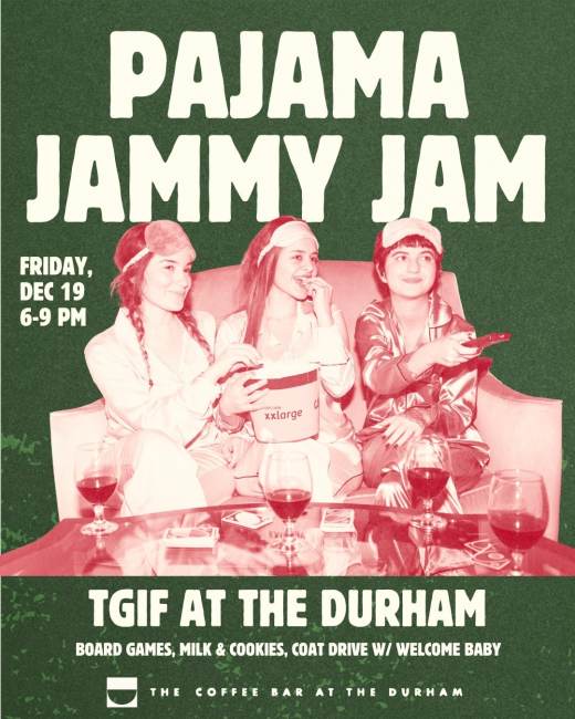 This December, TGIF at the Coffee Bar brings you Pajama Jammy Jam, a cozy night built around comfort food, cookie decorating, and that unmistakable ’90s holiday nostalgia, all while supporting a winter coat drive with Welcome Baby.