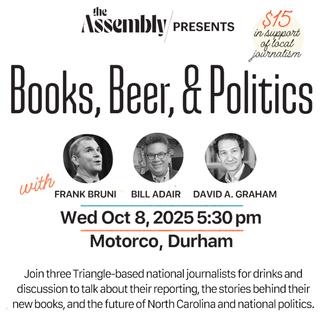 Join three Triangle-based national journalists for drinks and discussion at Durham’s Motorco Music Hall, where they will talk about the stories behind their new books and the future of North Carolina and national politics. All proceeds from the evening will support The Assembly’s reporting and our work to strengthen local journalism in North Carolina.
