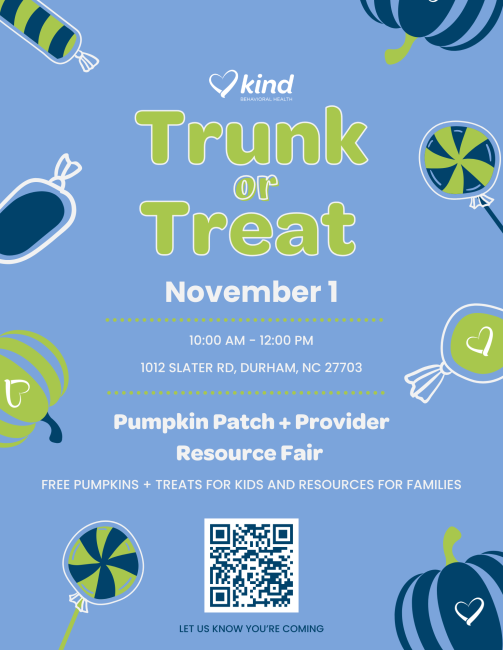 Enjoy a FREE sensory-friendly Trunk or Treat and pumpkin decorating event! Along with Kind Behavioral Health, several local providers will be there to share about their services and connect with families. Plus, the Durham Fire Department is stopping by — and they’re bringing their fire truck for kids to explore! 🚒