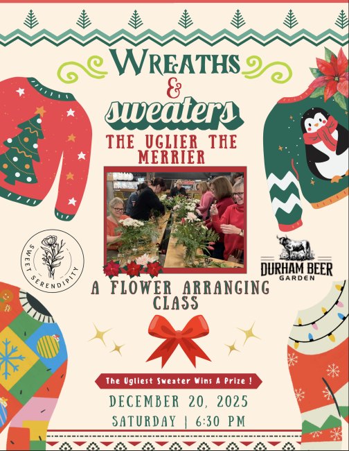 Get ready to deck the halls and flaunt your most fabulously awful holiday sweater! Join us at Durham Beer Garden on Saturday, December 20th at 6:30 PM for Wreaths & Sweaters: The Uglier the Merrier — a joyful, hands-on flower arranging class hosted in partnership with Sweet Serendipity.